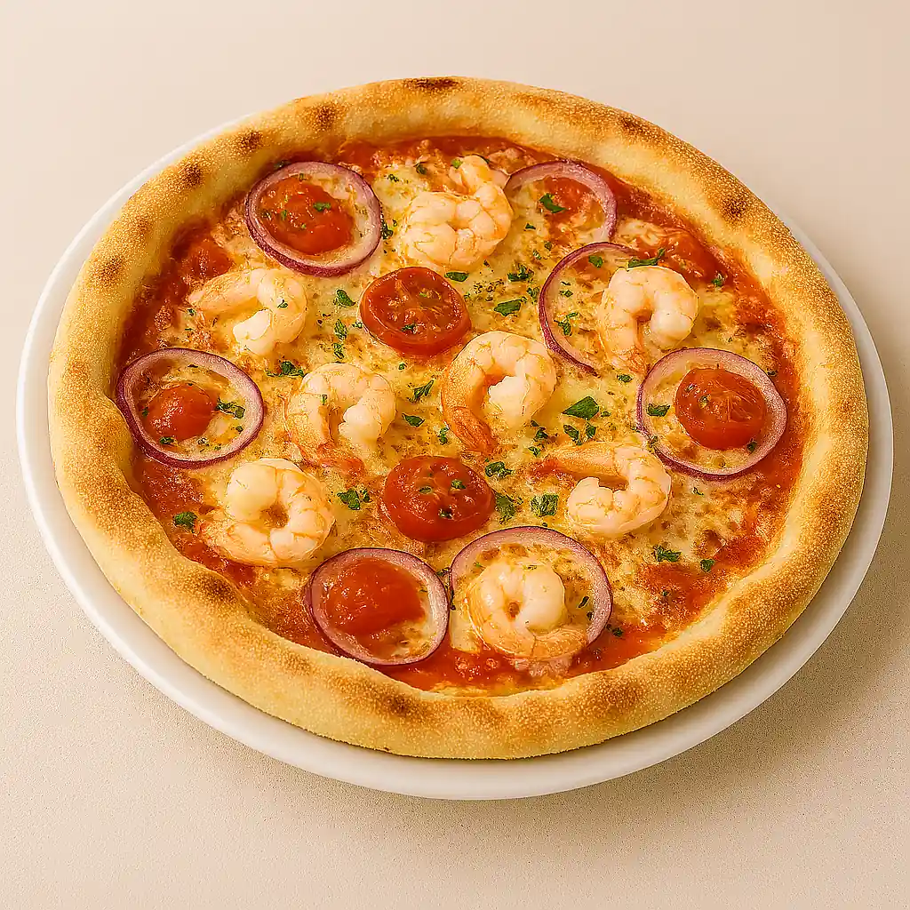 mit Mozzarella, Tomatensauce ,Kirschtomaten, Garnelen, Zwiebeln und Knoblauch