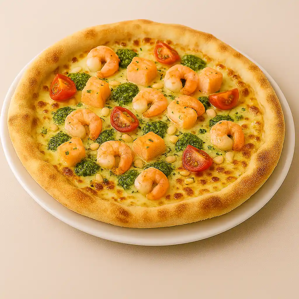 mit Mozzarella, Lachs, Garnelen, frischen Tomaten, Basilikum-Pesto und Pinienkernen (ohne Tomatensauce)